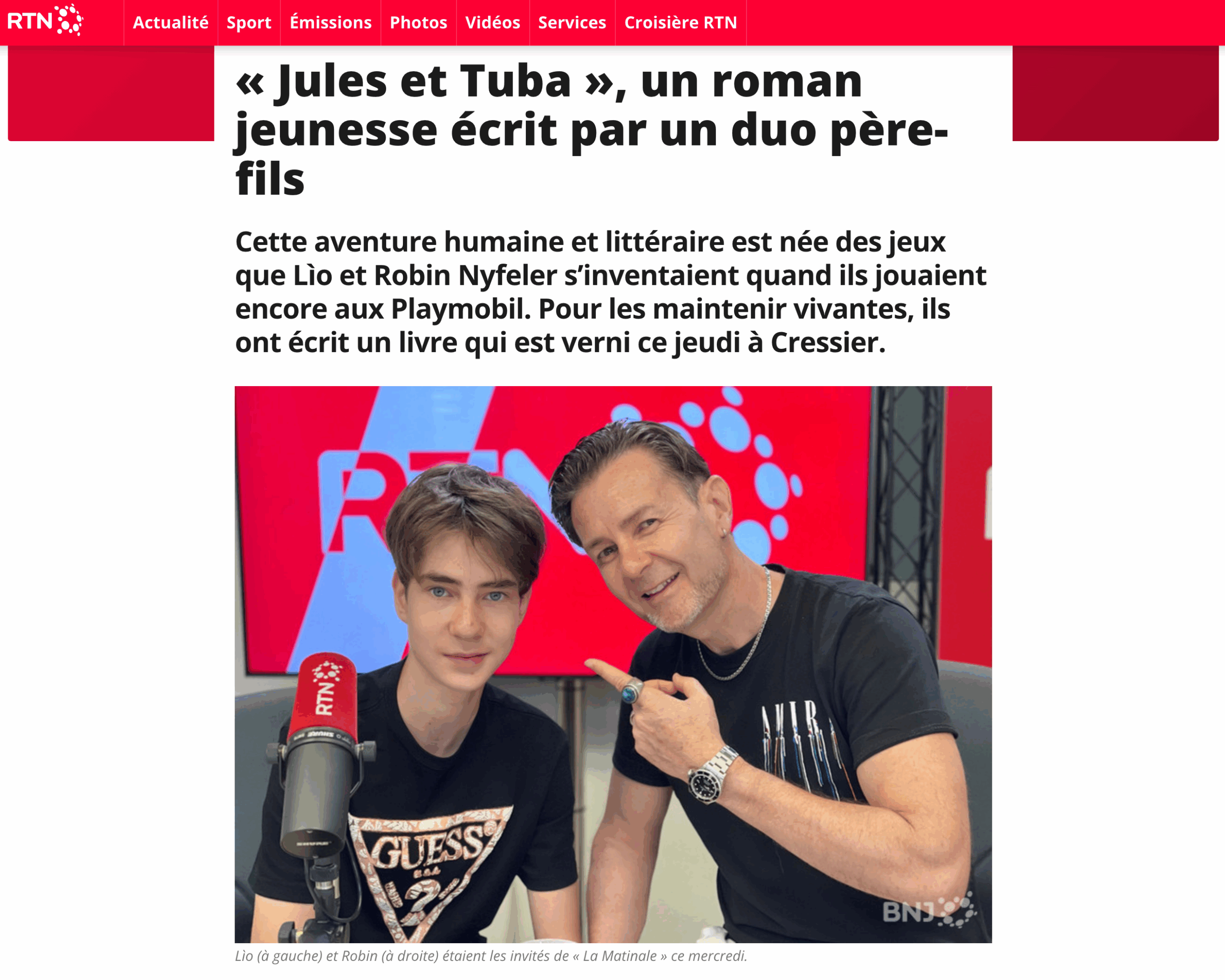 Un nouveau roman jeunesse vient de paraître chez i-liredition jeunesse. Plus qu’un roman jeunesse, c’est une aventure. Une aventure humaine, une aventure familiale et une aventure d’écriture. « Jules et Tuba » a été écrit par Lìo et Robin Nyfeler, le fils et le père, pendant deux ans. Il est préfacé par l’écrivain et procureur neuchâtelois Nicolas Feuz. Lìo Nyfeler, 16 ans, a expliqué mercredi dans La Matinale qu’étant fils unique, il a toujours beaucoup joué avec son père aux Playmobil. « Et maintenant que j’ai seize ans, on ne joue plus, et on a décidé de garder une trace de nos jeux et de nos aventures. » De là est né ce roman qui a « été adapté à tous les âges et pour plaire à tout le monde ».